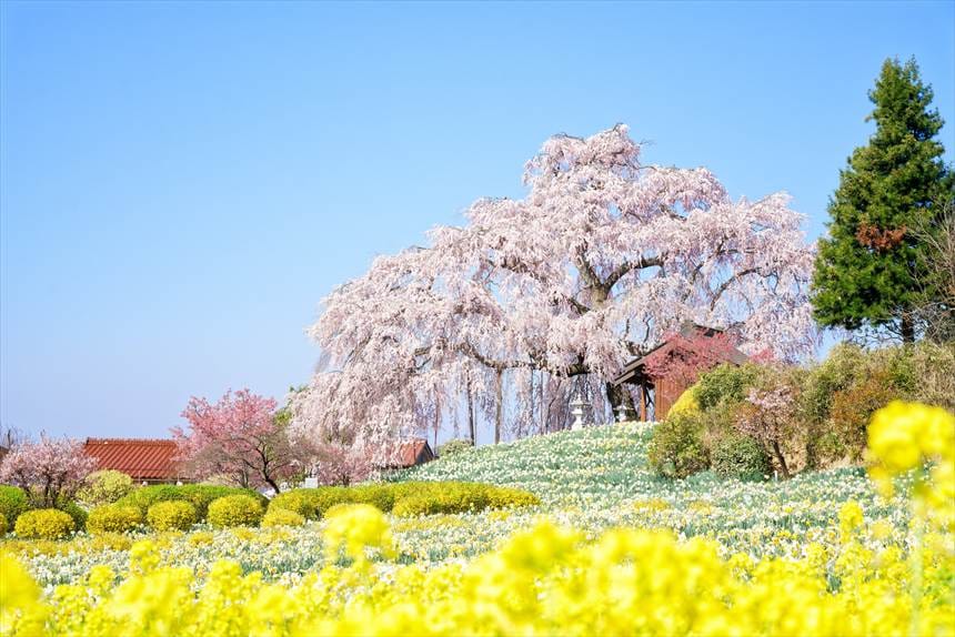 本堂の前には、まるで大きな傘を広げたような、均整の取れた美しいしだれ桜があります。桜以外にも天然記念物に指定されている「コウヨウザン」の巨木もあるのでそちらも合わせて鑑賞くださいね!