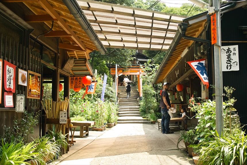 そして、多くの人が訪れる一番の目的は、本殿の奥にある千本鳥居です。左右に鳥居が連なるこの場所は、いつ行っても多くの人で賑わいます。特に紅葉シーズンは東京の竹下通りのような混雑具合で、進むのも大変なので、写真を撮りたい人は早朝に行くのがおすすめです。