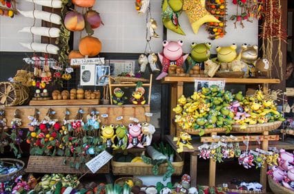五箇山のお土産屋さんは、どこか懐かしい、そして温かい雰囲気が漂っています。ここでは思わず手に取ってしまうような、かわいらしい手作りの品々がたくさんありました。特に印象的だったのは、木製の野菜や果物、そしてカエルなどの動物をモチーフにした置物です。どれも温かみがあって、とてもいいお土産だと思います。
