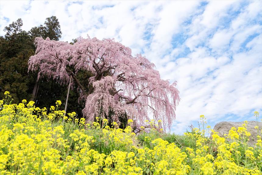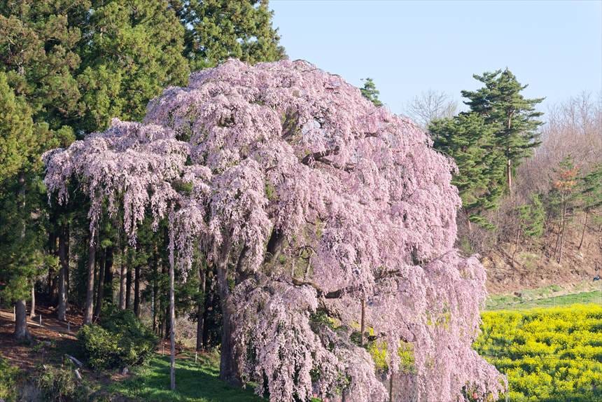 また、合戦場のしだれ桜が生えている小高い丘には、毎年菜の花が植えられており、菜の花と桜のコントラストも非常に美しいです。