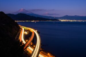 ブルーアワーから、夜になるのはすぐです。海岸は非常に暗くなるため、足元を照らすライトや懐中電灯を持参されると安心です。夜の富士山と街の灯り、そして波の音が織りなす幻想的な雰囲気もまた格別です。三脚もお忘れなく!!