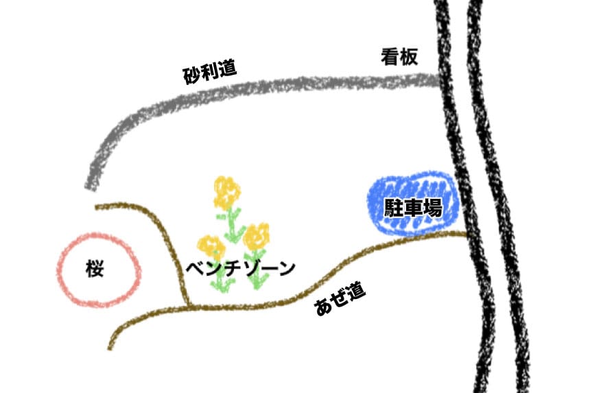 駐車場からまっすぐ来ると、上記写真の左側ベンチゾーンに出ます。上記写真のように桜を斜面の上から見たい方は、そのまま上に登ってください。