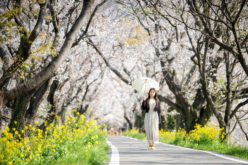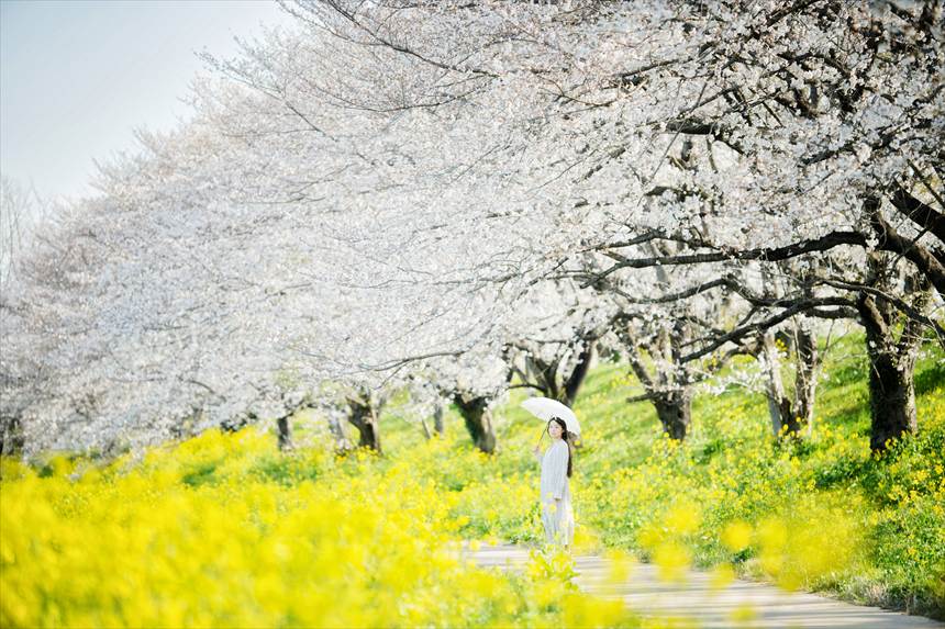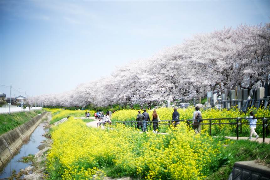 堤の下を歩けば、両脇に広がる菜の花の絨毯とモリモリの桜に包まれる、まさに「ザ・春爛漫」な世界。