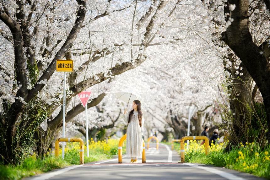 そして堤の上に登れば、桜のトンネルと菜の花と標識がどこか懐かしい「ザ・青春」な光景を描き出します。