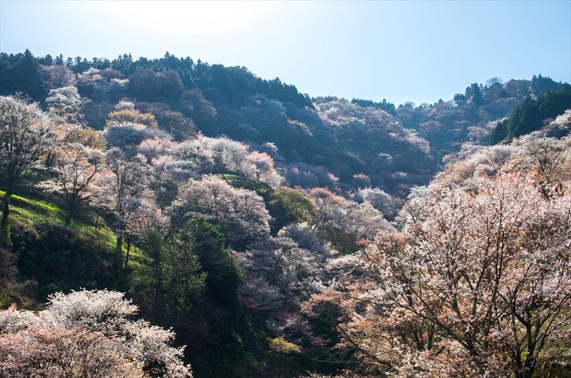 「吉野」の桜は、「吉野山」という広大な山全てが桜で埋め尽くされているわけではありません。山中の「下千本」「上千本」「中千本」「奥千本」という4カ所に密集して桜が植えてあります。どの場所も桃源郷のような素晴らしい光景で、「一目に千本見える豪華さ」という意味で「一目千本」とも言われます。